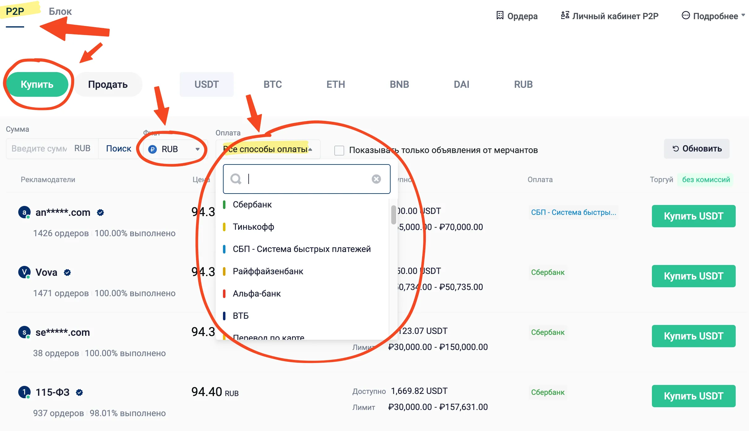 Переходите в раздел “Купить крипту -> P2P” и далее выбирайте рубли и нужный вам российский банк.